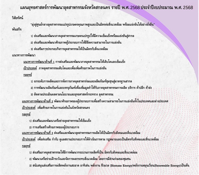 แผนปฏิบัติการด้านการพัฒนาอุตสาหกรรมจังหวัดสกลนคร รายปี พ.ศ. 2568